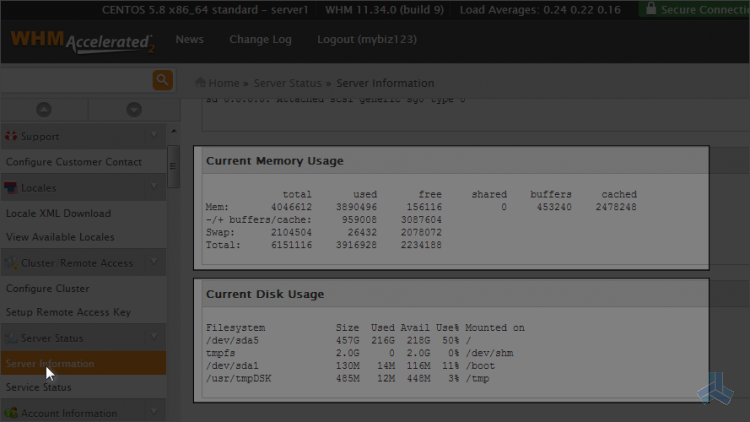 Let's take a look at the server status section of WHM and the two options:  server information and service status.
